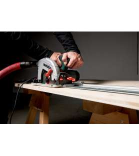Robuste tragbare Kreissäge Metabo KS 85 FS, die direkt auf Führungsschienen von Metabo und anderen Herstellern für lange und präzise Schnitte verwendet werden kann