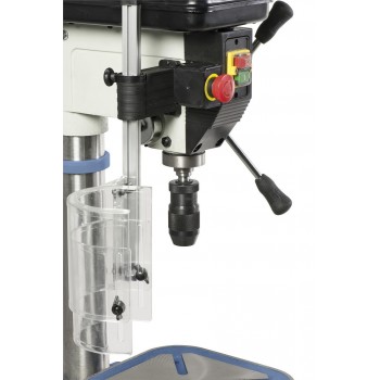 Schnellspannbohrfutter 1 - 16 mm / B 18, eine Futteraufnahmewelle CM 4 / B 18, Links-/Rechtslaufumschalter, höhenverstellbare Schutzhaube, separater Not-Aus-Taster, Nutensteine und Servicewerkzeug
