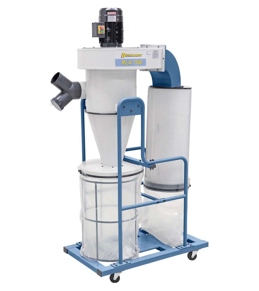 La 1ère filtration, présente sous forme de cyclone, a pour but de séparer l’air des particules de bois en suspension, par centrifugation.La seconde filtration de l’air par cartouche filtrante, récupère les poussières résiduelles grâce à un sac en pvc.
