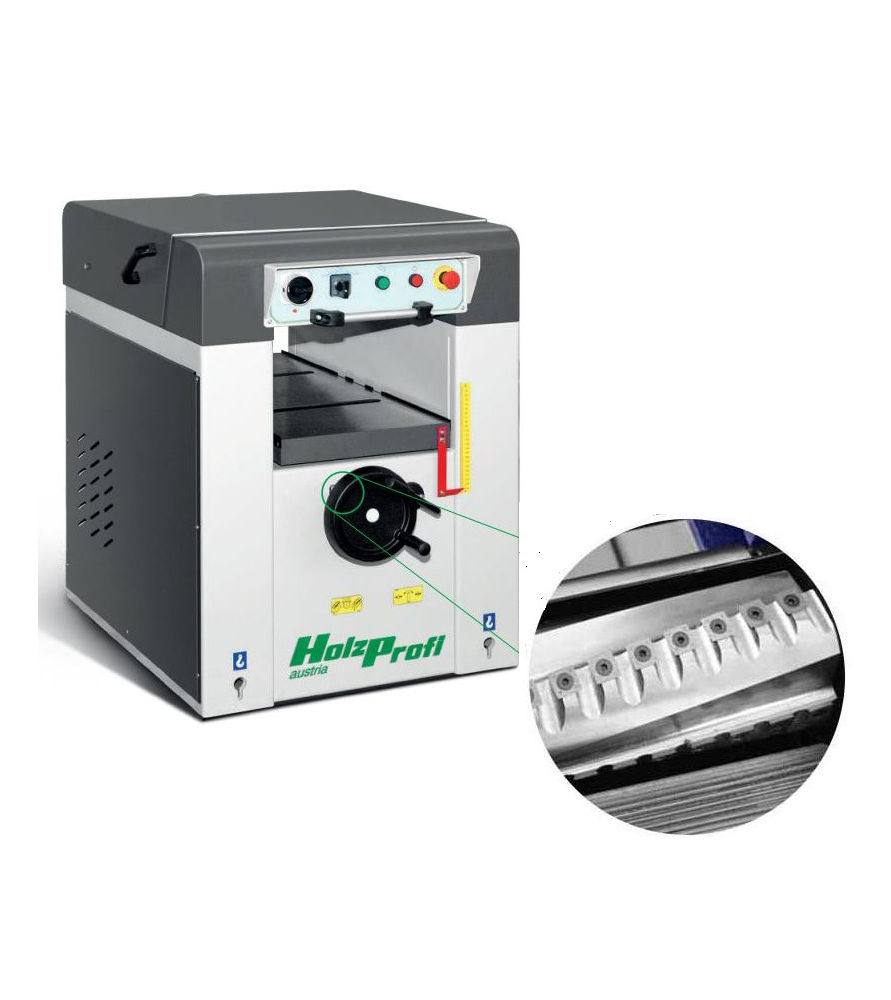 Cette raboteuse Holzprofi DMS41 avec arbre hélicoïdal possède une table monobloc de 800 mm de longueur en fonte rectifiée est idéale pour un travail propre dans les petits ateliers.